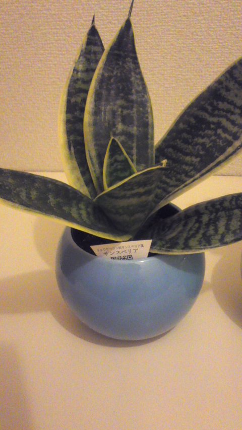 サンセベリア。木製の立派な鉢に入った、高さ40cmくらいのイケメンです。