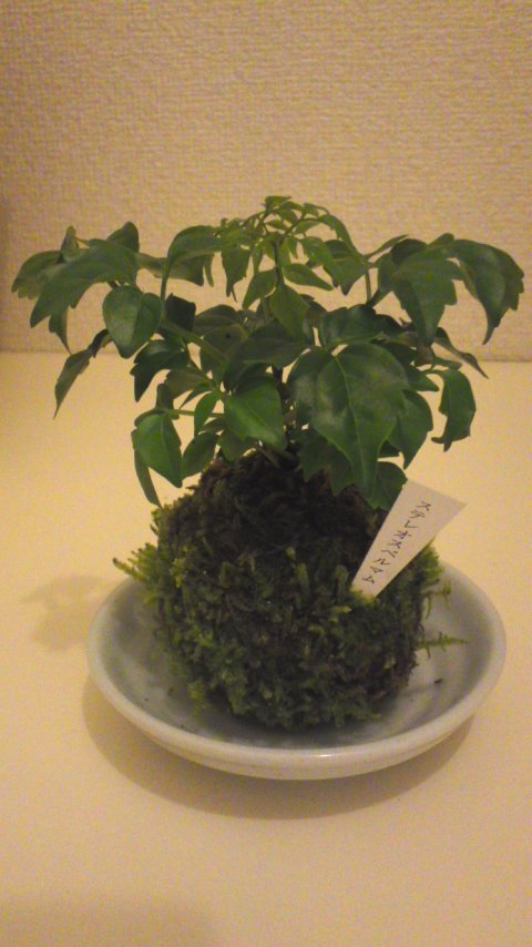 苔玉に刺さったステレオスペルマム。つやつやした葉っぱがとても綺麗な子です。