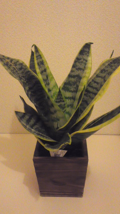 サンセベリア。木製の立派な鉢に入った、高さ40cmくらいのイケメンです。