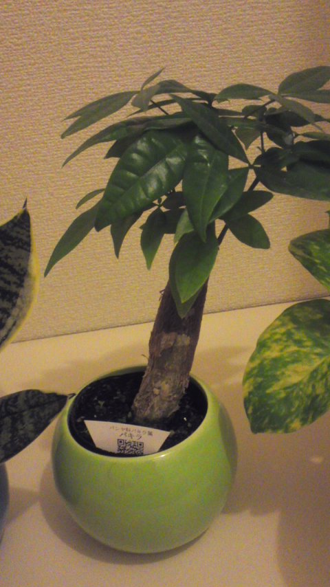 パキラ。これも丸い陶器の鉢植えですが、鉢の中の容器が傾いていました。