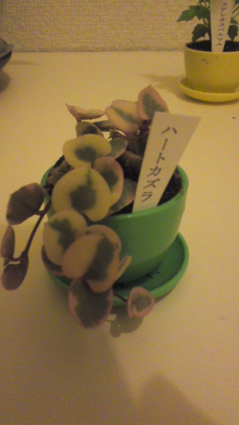 ハートカズラ。その名の通り、葉っぱがハート型。葉の外側がピンクです。うちに来たときは鉢から落ちてしまっていて、葉っぱも一部ヘタってました・・・。元気になってくれるといいけど・・・。